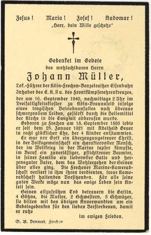 | ∞ 28.01.1921 mit Adelheid Geuer, 4 Söhne; Lok.-Führer der Köln-Frechen-Benzelrather-Eisenbahn; tragischer Betriebsunfall; Mitglied der Frechener Marine-Kameradschaft; |