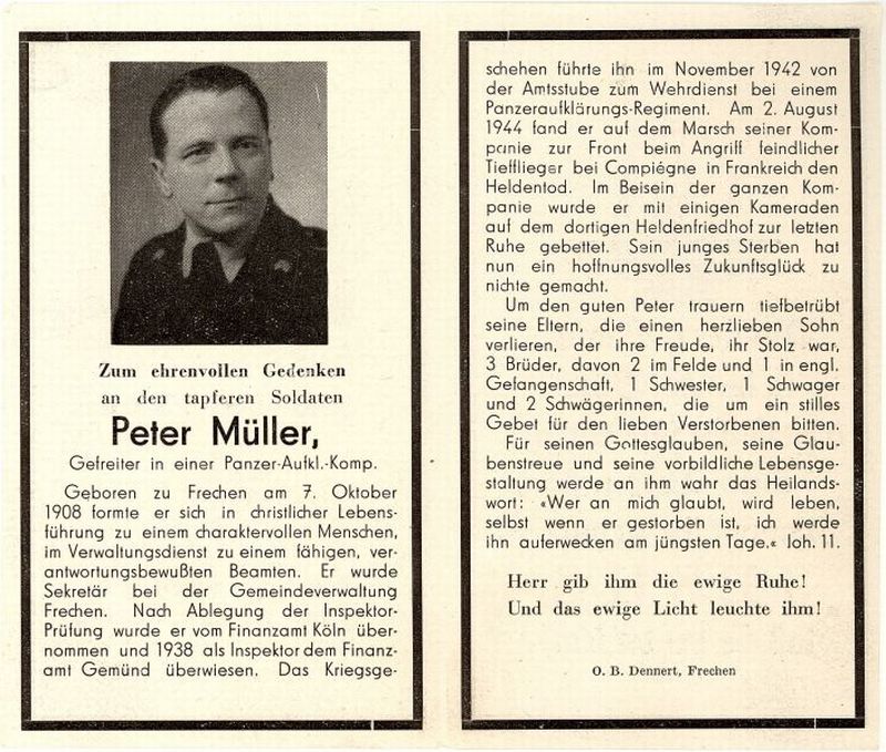 | im 2. Weltkrieg gefallen; Gefreiter in Panzer-Aufkl.-Komp.; |