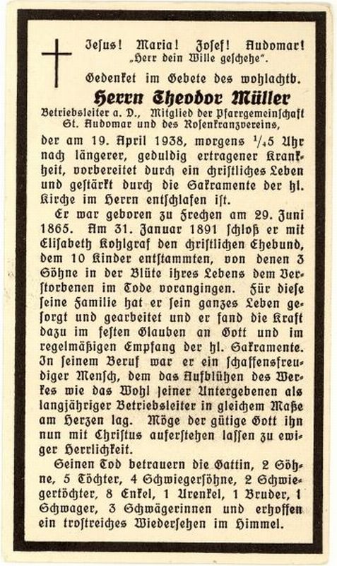 | Betriebsleiter a.D.; ∞ 31.01.1891 mit Elisabeth Kohlgraf; 10 Kinder, davon 3 Söhne †; |