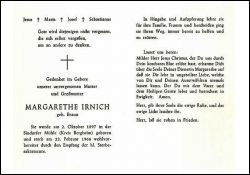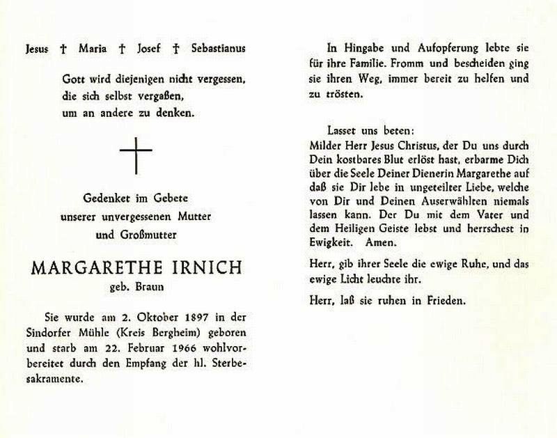 | Totenzettel-Nr.: | 14517 |  | Name: | Irnich, geb. Braun |  | Vorname: | Margarethe |  | Geburtsort: | Sindorfer Mühle (Kreis Bergheim) |  | Geburtsdatum: | 02.10.1897 |  | Sterbedatum: | 22.02.1966 |  | Bearbeiter: | Ulrich Jaskulski - FGV Frechener Geschichtsverein |  | Sammlung: | Karl Baumann, Frechen |  | Sonstiges: |  | Mutter und Großmutter; |  |
