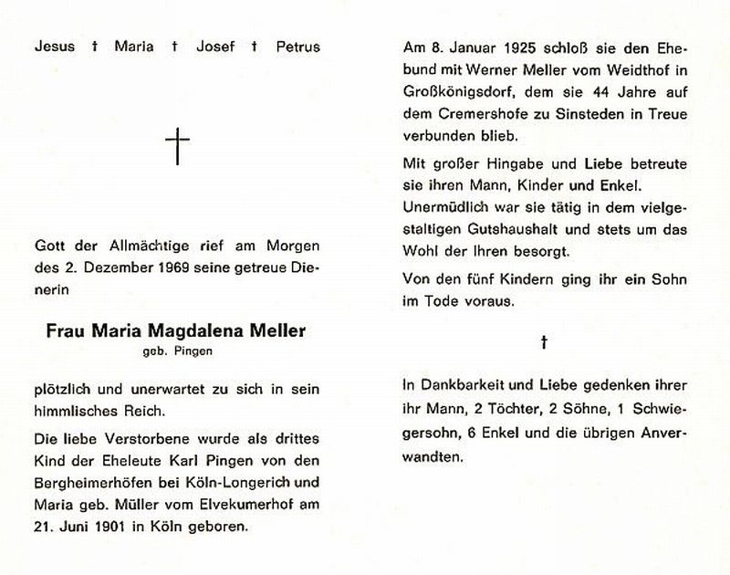 Eltern Eheleute Karl Pingen Maria geb. Müller; ∞ am 08.01.1925 mit Werner Meller vom Weidthof in Großkönigsdorf; 5 Kinder, davon 1 †; |