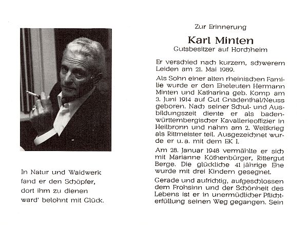 Eltern Hermann Minten und Katharina geb. Komp; ∞ am 28.01.1948 mit Marianne Köthenbürger; 3 Kinder; Gutsbesitzer auf Horchheim; |
