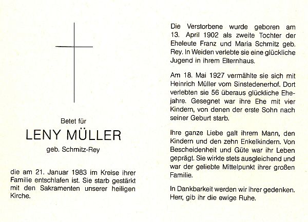 Eltern Franz und Maria Schmitz geb. Rey; verlebte in Weiden eine glückliche Jugend; ∞ am 18.05.1927 mit Heinrich Müller von Sinstedenerhof; 4 Kinder, davon 1 Sohn †; |