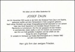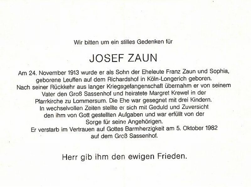 Eltern Franz Zaun und Sophia geb. Leuffen; nach langer Kriegsgefangenschaft übernahm er den Groß Sassenhof; ∞ in der Pfarrkirche zu Lommersum mit Margret Krewel; 3 Kinder; |