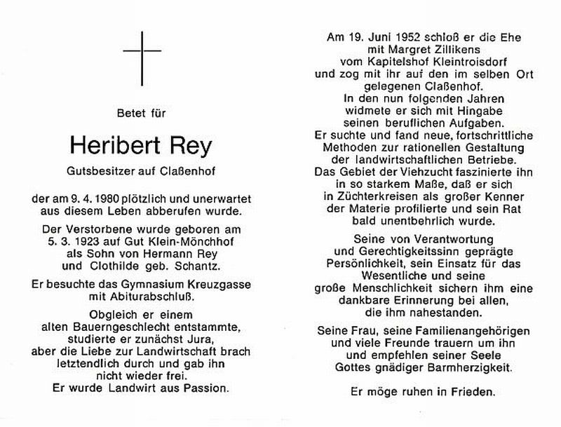 Eltern Hermann Rey und Clothilde geb. Schantz; ∞ am 19.06.1952 mit Margret Zillikens vom Kapitelshof Kleintroisdorf; Gutsbesitzer auf Claßenhof; |