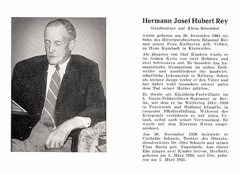 Eltern Edmund Rey und Katharina geb. Velder; Teilnehmer 1. Weltkrieg; ∞ am 20.11.1920 mit Clothilde Schantz; 2 Kinder; Gutsbesitzer auf Klein-Mönchhof, Kreis Bergheim; |