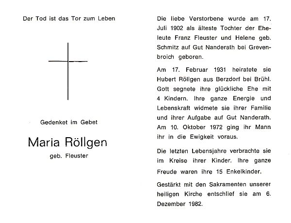 Eltern Franz Fleuster und Helene geb. Schmitz; ∞ am 17.02.1931 mit Hubert Röllgen - 10.10.1972 † - aus Berzdorf bei Brühl; 4 Kinder; |