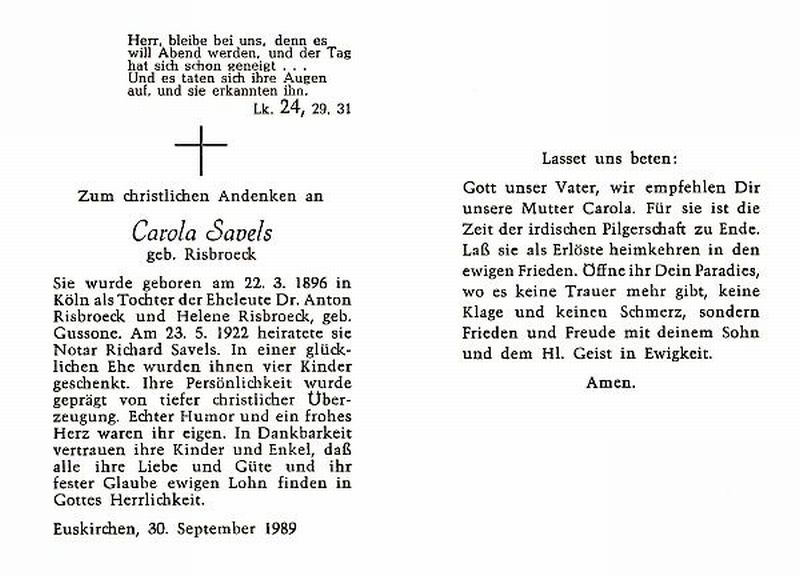 Eltern Dr. Anton Risbroeck und Helene geb. Gussone; ∞ am 23.05.1922 mit Notar Richard Savels; 4 Kinder; |