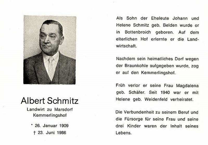 Eltern Johann und Helene Schmitz geb. Belden; 1. ∞ mit Magdalena geb. Schäfer †; 2. ∞ 1940 mit Helene geb. Weidenfeld; Landwirt zu Marsdorf Kemmerlingshof; |
