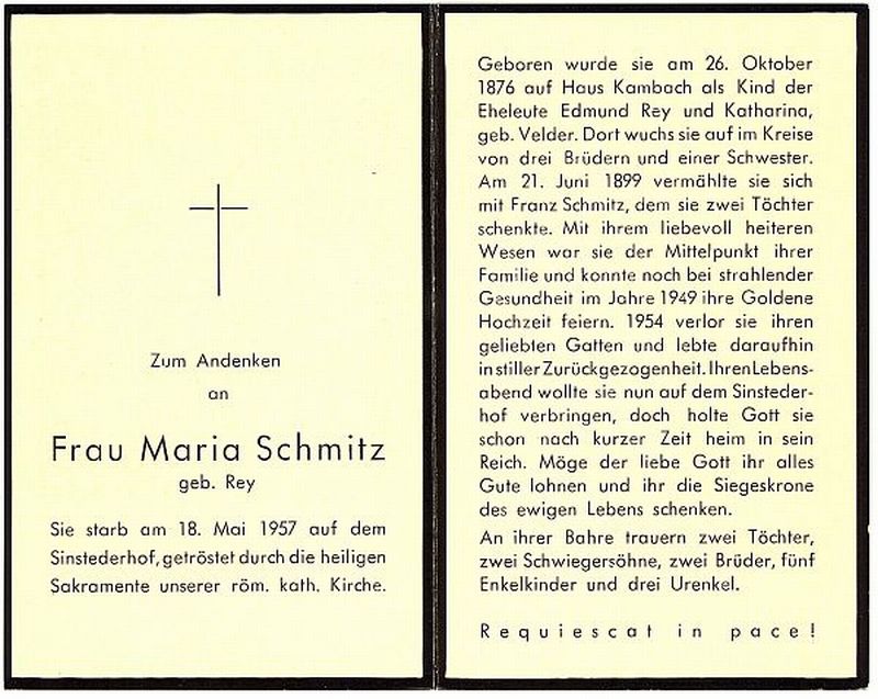 Eltern Edmund Rey und Katharina geb. Velder; ∞ am 21.06.1899 mit Franz Schmitz; 2 Töchter; |