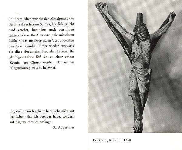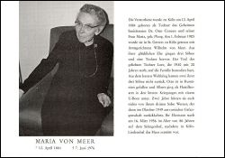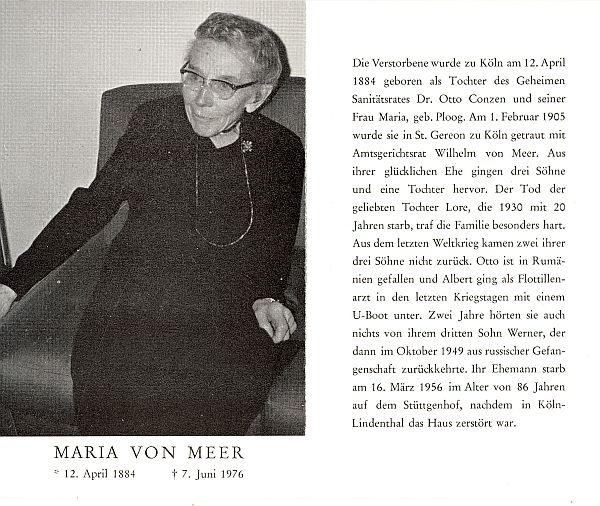 Eltern Dr. Otto Conzen und Maria geb. Pl∞g; ∞ am 01.02.1905 in St. Gereon in Köln mit Amtsgerichtsrat Wilhelm von Meer, 16.03.1956 †; 3 Söhne, 1 Tochter; |