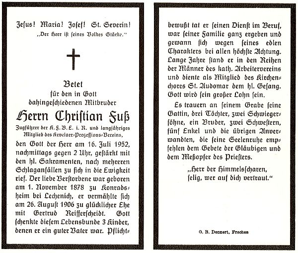 ∞ am 26.08.1906 mit Gertrud Reifferscheidt; 3 Töchter; Zugführer der K.F.B.E. i.R.; Mitglied des Kevelaer-Prozessions-Vereins; |