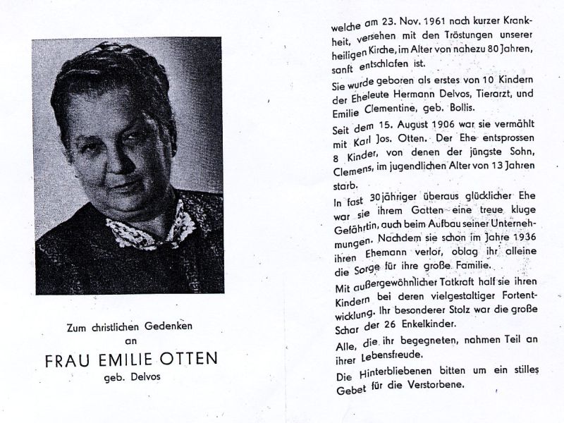 | Fast. 80 J.; Eltern: Tierarzt Hermann Delvos u. Emilie Clementine geb. Bollis; ∞ 15.8.1906 Karl Jos. Otten, † 1936; 8 K.; jüngster Sohn Clemens † mit 13 J.; |