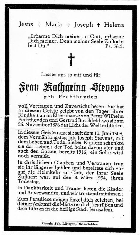 | Eltern: Peter Wilhelm Pechtheyden u. Gertrud geb. Buschfeld; ∞ 10.6.1908 Joseph Stevens, † 1916; 7 K., davon 4 †; 1 Sohn noch vermißt (2. Weltkrieg) |