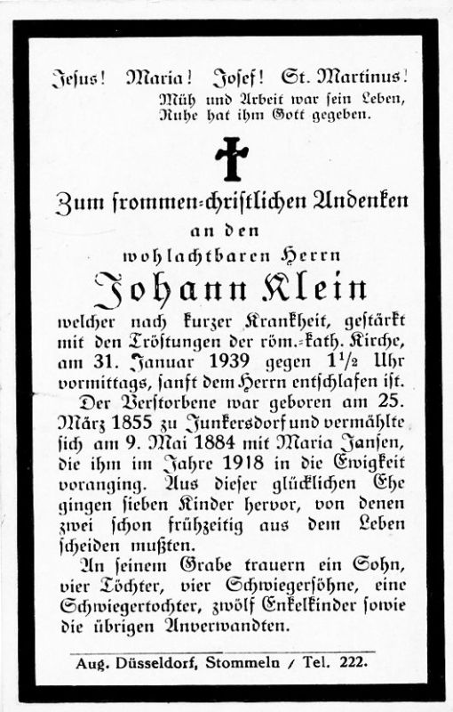 | ∞ 9.5.1884 Maria Jansen, † 1918; 7 K., davon 2 † (gedruckt in Stommeln) |