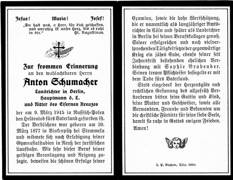 | Gefallener 1. Weltkrieg; Hauptmann d.L.; Gymnasium Neuss; Amtsrichter in Köln, dann Landrichter in Berlin; ∞ Sophie Brabender |