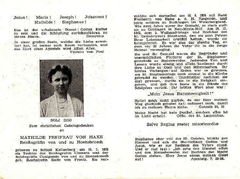 Tochter des Reichsgrafen Clemens und der Reichsgräfin Cunigunde von und zu Hoensbroech geb. Reichsfreiin Raitz von Frentz; ∞ am 16.09.1924 mit Hans Freiherrn von Hake a.d.H. Hasperde; |