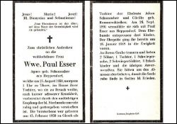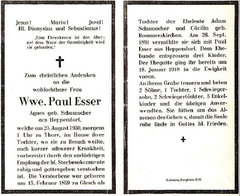 | Eltern Adam Schumacher und Cäcilia geb. Rommerskirchen; ∞ am 26.09.1891 mit Paul Esser aus Heppendorf † am 18.01.1918; 3 Kinder, |