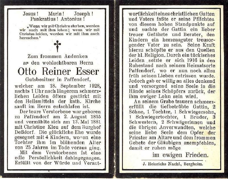 | Gutsbesitzer in Paffendorf; ∞ am 13.05.1881 mit Christine Kleu auf dem Burghof Deßdorf; 4 Kinder, davon 1 Tochter im Alter von 25 Jahren gestorben; |