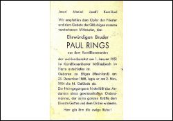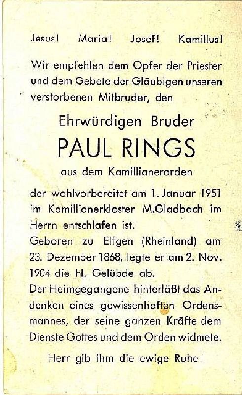Ehrwürdiger Bruder aus dem Kamillianerorden; legte hl. Gelübde ab am 02.11.1904; |