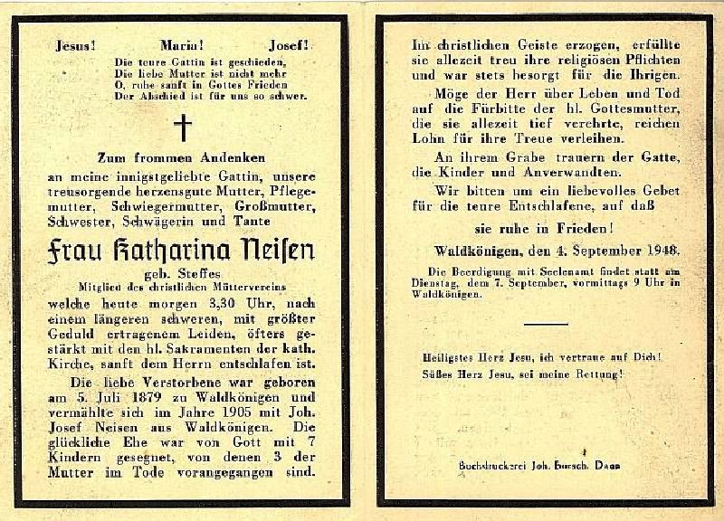 ∞ in 1905 mit Joh. Josef Neisen aus Waldkönigen; 7 Kinder, davon 3 †; |