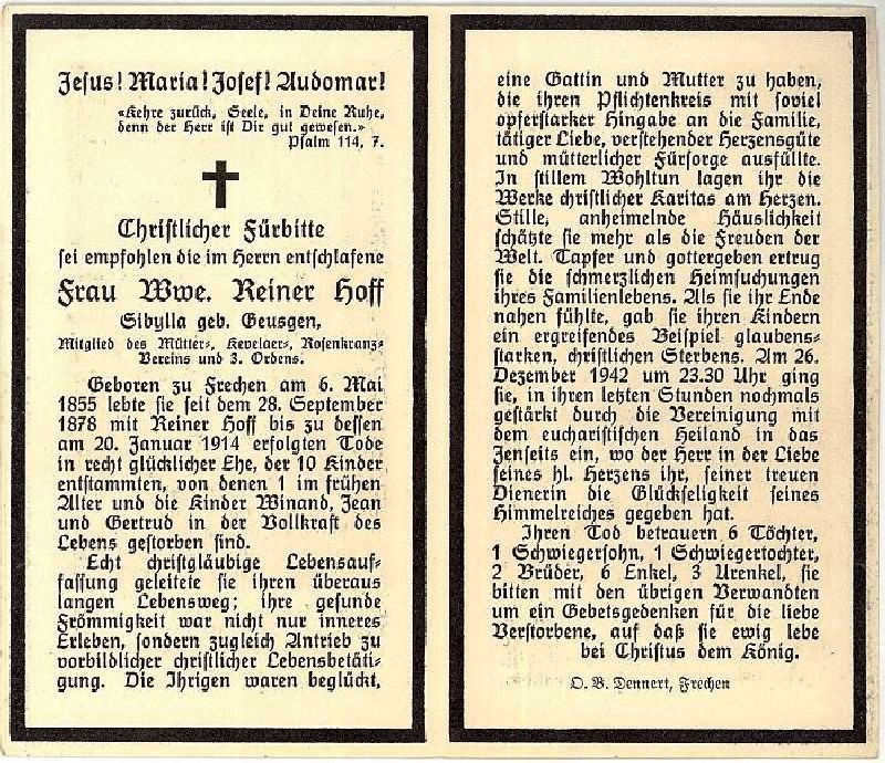 ∞ am 28.09.1878 mit Reiner Hoff - 20.01.1914 †: 10 Kinder; Mitglied des Mütter-, Kevelaer-, Rosenkranz-Vereins und 3. Orden; |