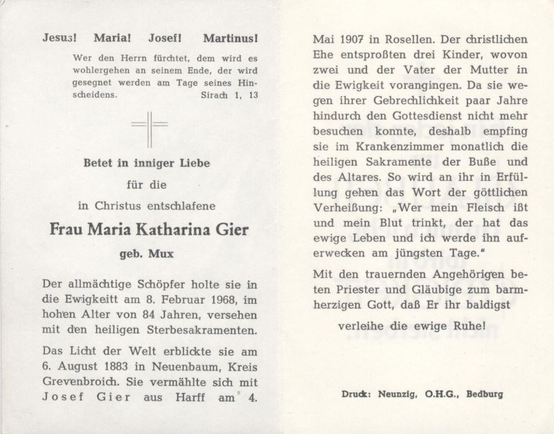 ∞ 4.5.1907 in Rosellen Josef Gier aus Harff; 3 K., davon 2 †; Druck in Bedburg/Erft |