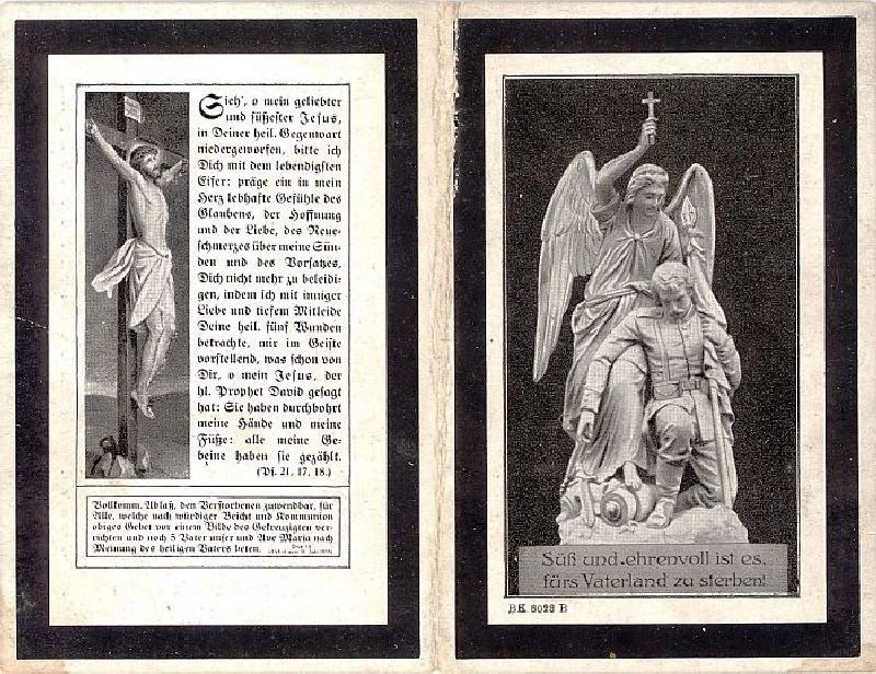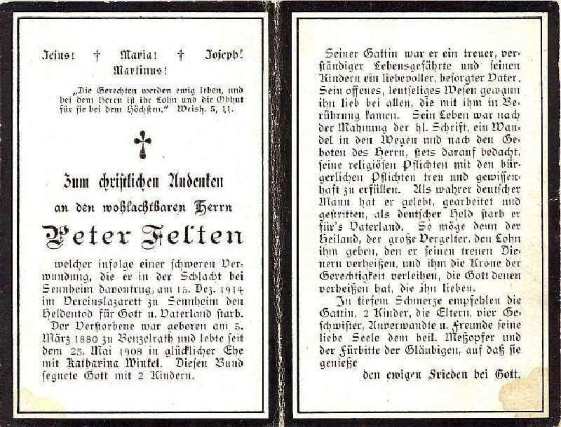 Gefallener 1. Weltkrieg; ∞ am 23.05.1908 mit Katharina Winkel; 2 Kinder; schwere Verwundung in der Schlacht bei Sennheim davongetragen; |