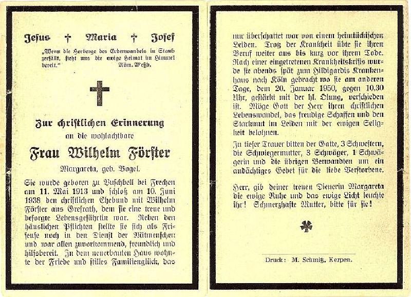 ∞ am 10.06.1938 mit Wilhelm Förster aus Grefrath; |