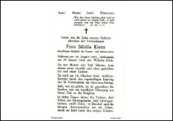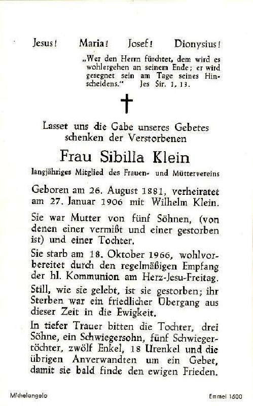 ∞ am 27.01.1906 mit Wilhelm Klein; 5 Söhnen und 1 Tochter, davon 1 vermißt und einer gestorben; |