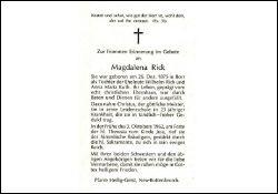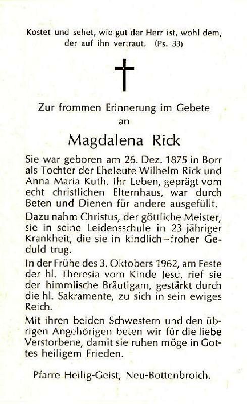 | Eltern Wilhelm Rick und Anna Maria Kuth; 23-jährige Krankheit; 2 Schwestern; |