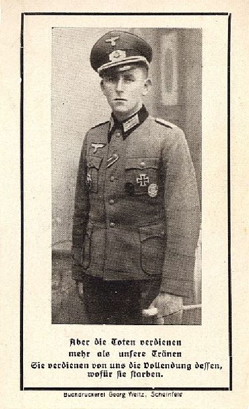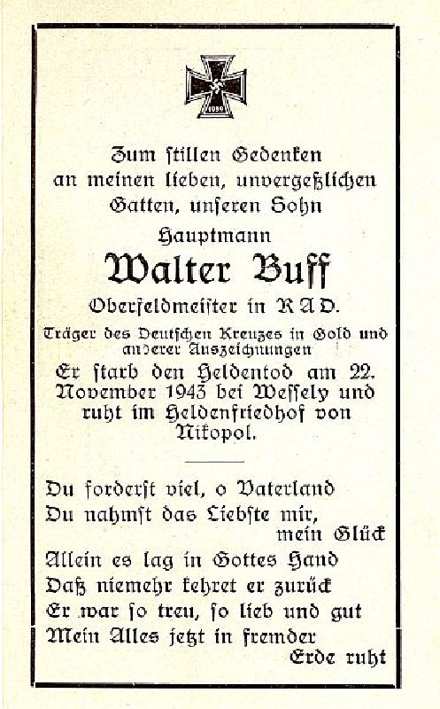 Gefallener 2. Weltkrieg; Hauptmann, Oberfeldmeister in RAD; Ehemann, 1 Sohn; ruht im Heldenfriedhof von Nikopol; |