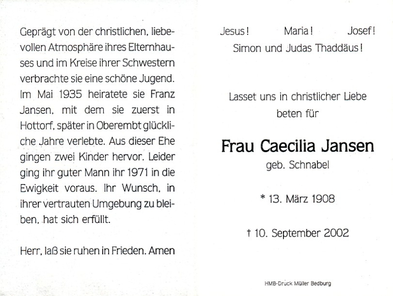 ∞ im Mai 1935 mit Franz Jansen, 2 Kinder, Ehemann 1971 †; |