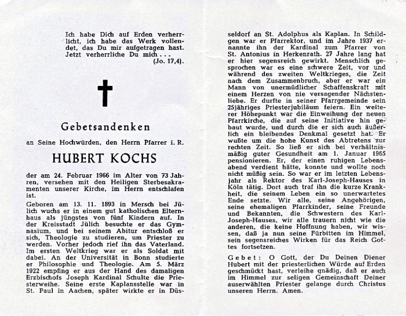 Pfarrer i.R.; am 05.03.1922 Priesterweihe durch Erzbischof Joseph Kardinal Schulte; wurde 1937 Pfarrer in Herkenrath; 27 Jahre segensreich gewirkt; wurde am 01.01.1965 pensioniert; |