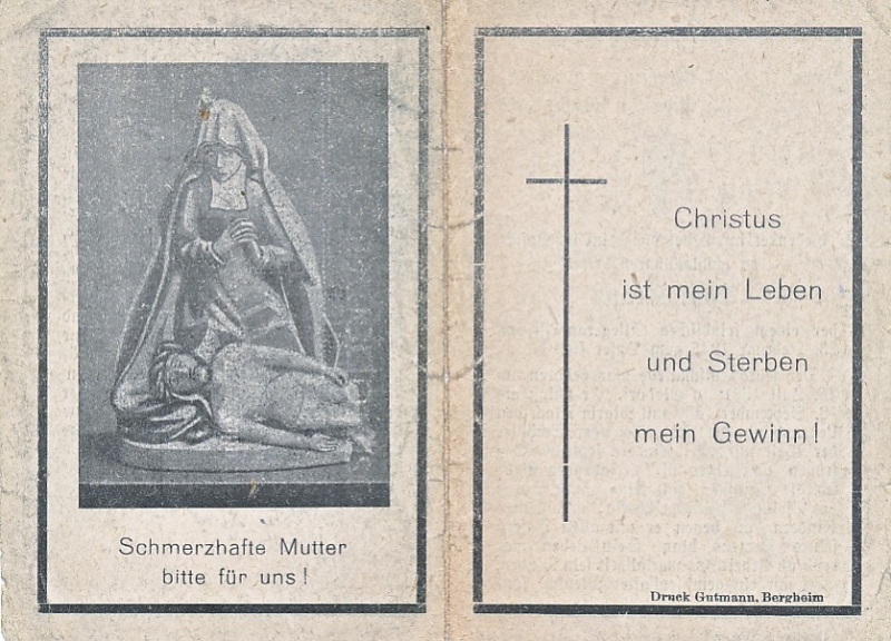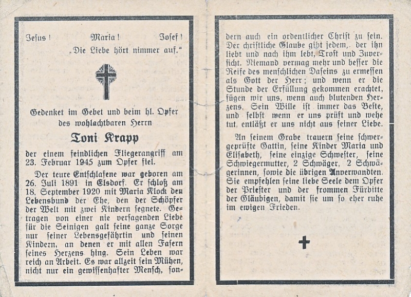 bei einem feindlichen Fliegerangriff zum Ppfer gefallen; ∞ am 18.09.1920 mit Maria Klock, 2 Kinder; |