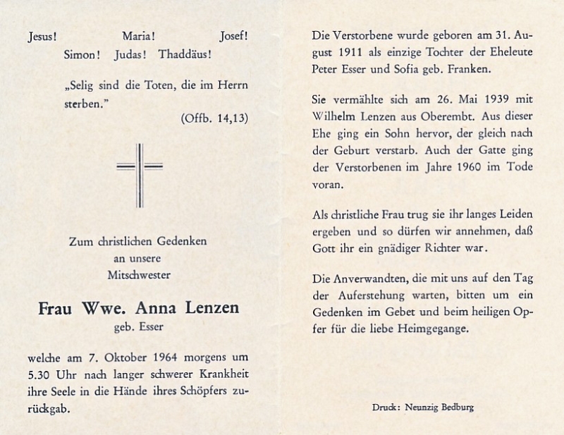 Eltern Peter Esser und Sofia Franken; ∞ am 26.05.1939 mit Wilhelm Lenzen aus Oberembt - 1960 †; 1 Sohn, gleich nach Geburt verstorben; |