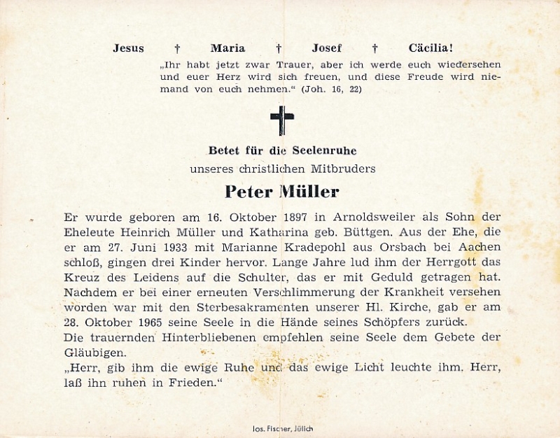Eltern Heinrich Müller und Katharina geb. Büttgen; ∞ am 27.06.1933 mit Marianne Kradepohl aus Orsbach b. Aachen; 3 Kinder, |