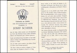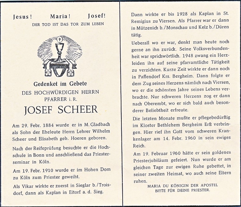Pfarrer i.R.; Eltern Lehrer Wilhelm Scheer und Elisabeth geb. Hoeren; Priesterweihe am 19.02.1910 im Hohen Dom zu Köln; Pfarrer in Mützenich b. Monschau und Kelz b. Düren; |