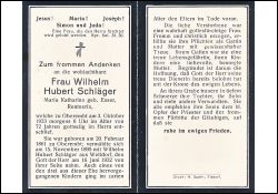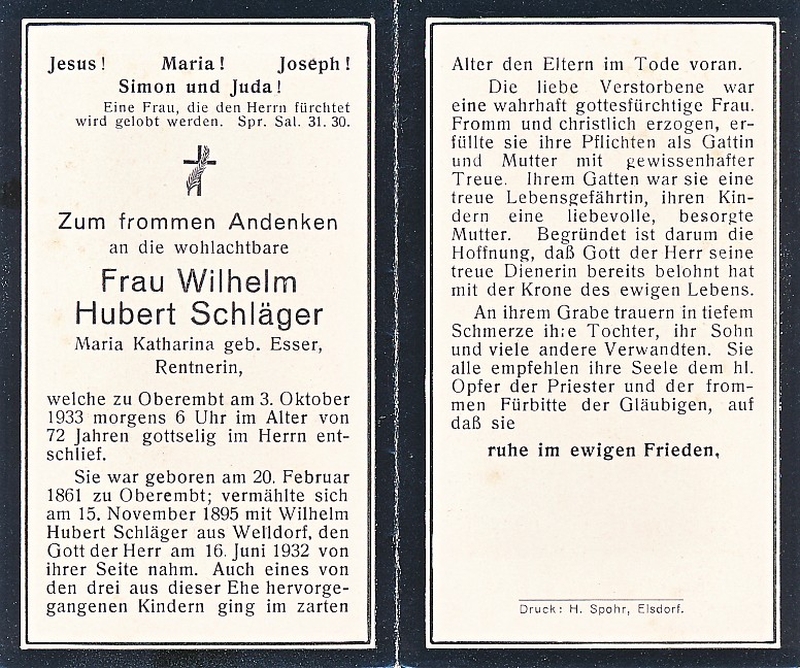 ∞ am 15.11.1895 mit Wilhelm Hubert Schläger aus Welldorf 16.06.1932 †; 3 Kinder, davon 1 bereits im zarten Alter gestorben; |