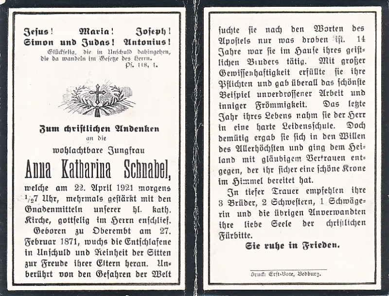 wohlachtbare Jungfrau; 14 Jahre bei Hause des geistlichen Bruders tätig; 3 Brüder, 2 Schwestern; |