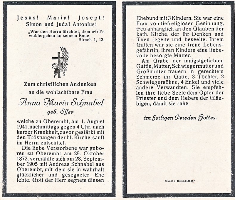 ∞ am 28.09.1905 mit Andreas Schnabel aus Oberembt; 3 Kinder; |