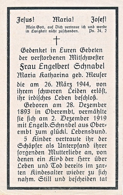 ∞ am 02.12.1919 mit Engelbert Schnabel aus Oberembt; 5 Kinder |