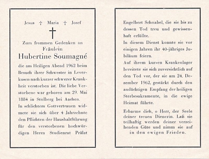 Fräulein, über 4 Jahrzehnte Haushaltsführung bei Herrn Prälat Engelbert Schnabel; |