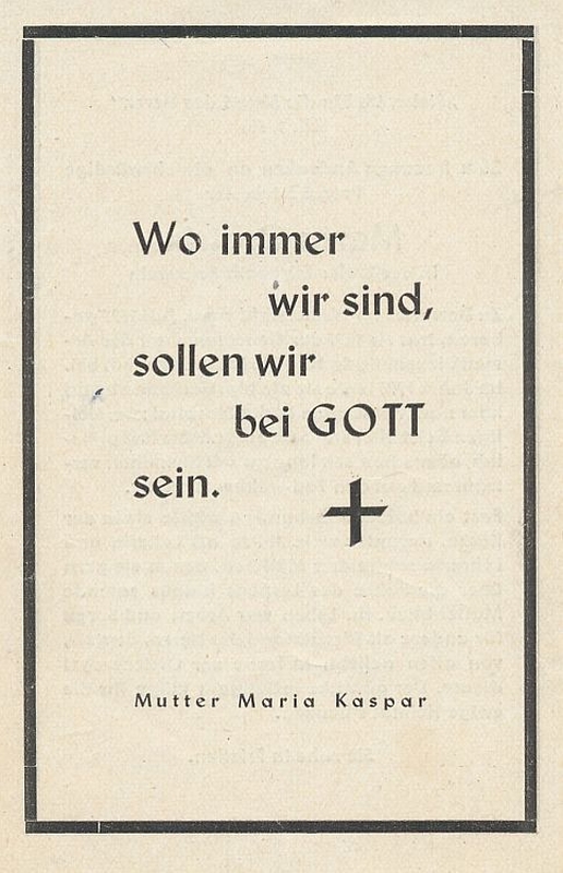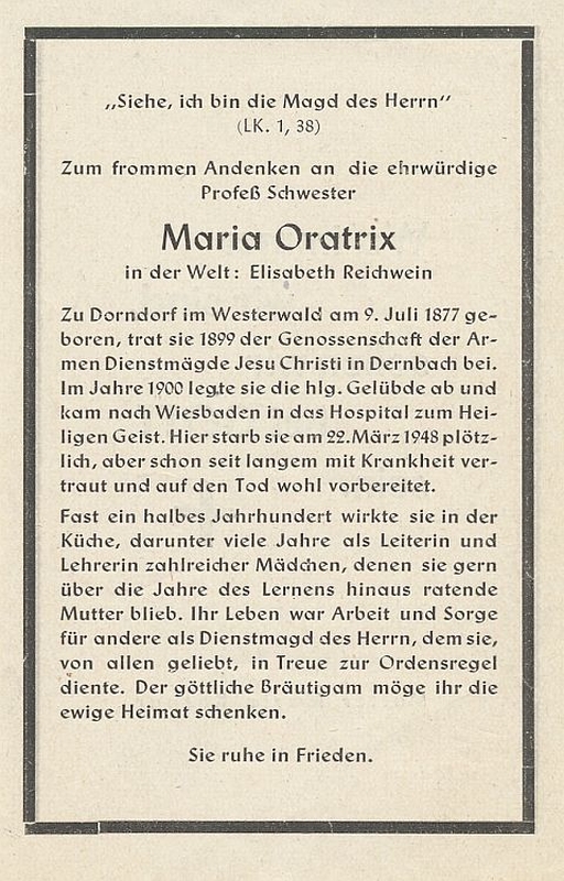Profess-Schwester, trat 1899 der Genossenschaft der Armen Dienstmägde Jesu Christi in Dernbach bei; 1900 legte sie die hlg. Gelübde ab un kam nach Wiesbaden in das Hospital zum Heiligen Geist; |