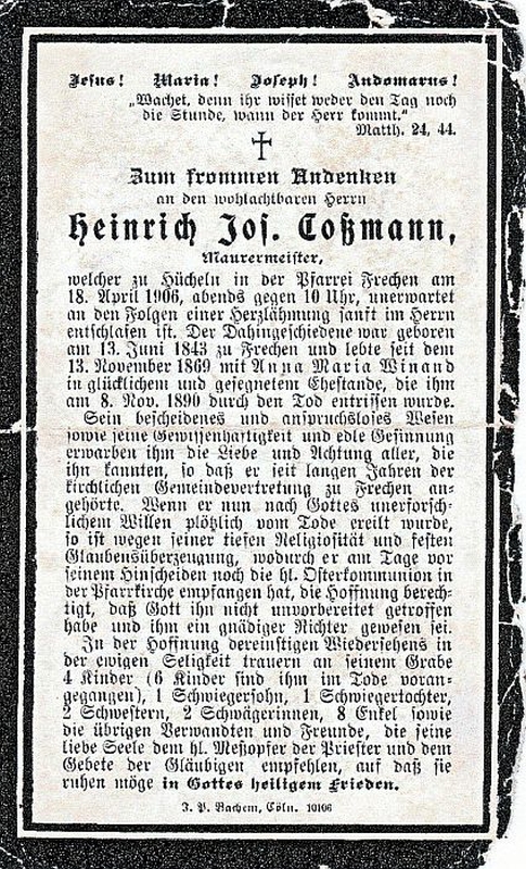 Maurermeister, ∞ am 13.11.1869 mit Anna Maria Winand - †; 08.11.1890; insges. 10 Kinder, davon sind bereits 6 gestorben; |