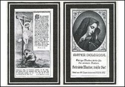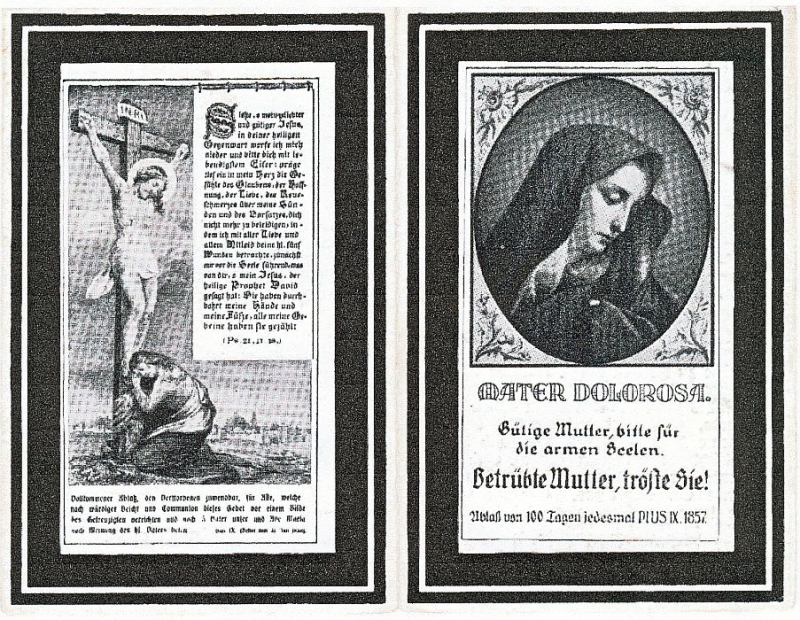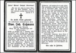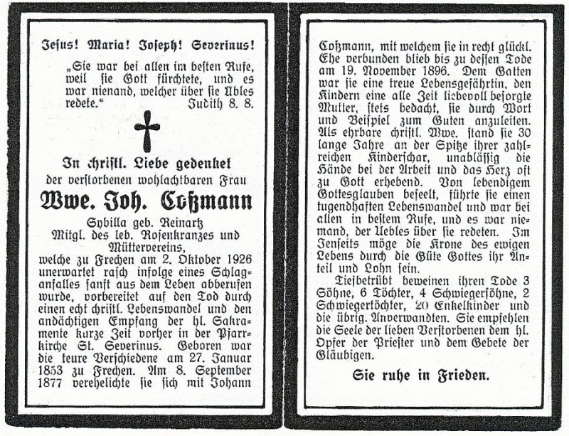 ∞ am 08.09.1877 mit Johann Coßmann, † 19.11.1896; 3 Söhne und 6 Töchter beweinen den Tod, Mitglied des leb. Rosenkranzes und Müttervereins; |