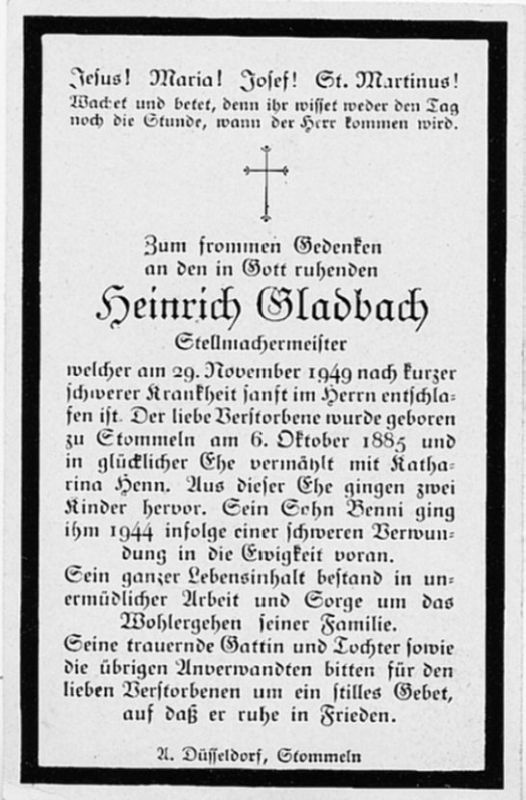 | Stellmachermeister; ∞ Katharina Henn; Sohn Benni gefallen 1944 |