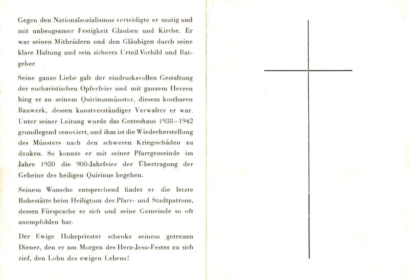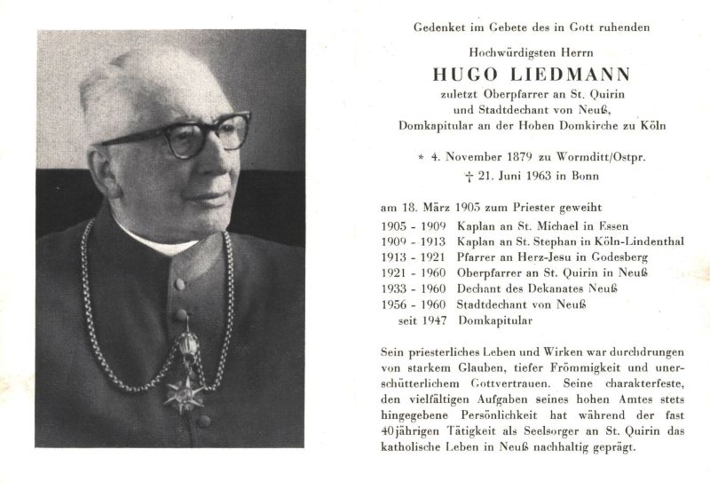 | Prietserweihe 18.3.1905; 1905-09 Kaplan St. Michael Essen, 1909-13 St. Stephan Köln-Lindenthal; 1913-21 Pfarrer Herz-Jesu Godesberg; 1921-60 Oberpfarrer St. Quirin in Neuss; Dechant, Stadtdechant, Domkapitular |