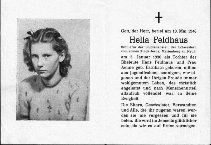 | Schülerin der Schule Marienberg in Neuss; Eltern: Hans Feldhaus u. Änne geb. Eschbach |