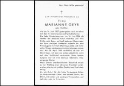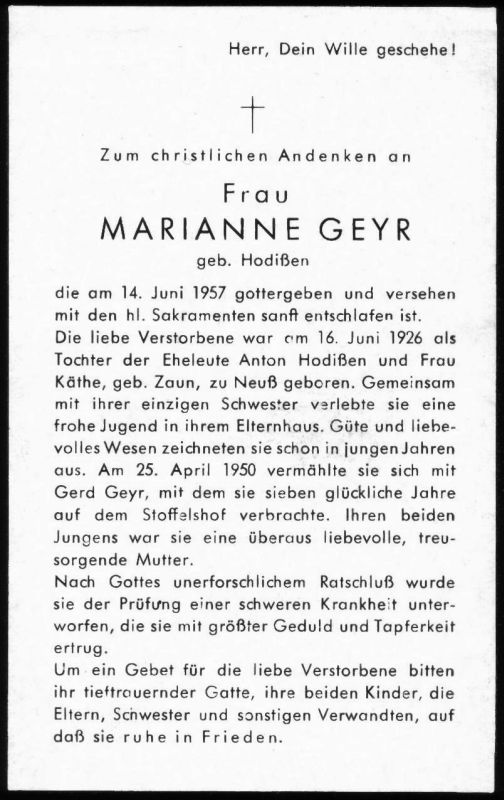 | Eltern: Anton Hodißen u. Käthe geb. Zaun; ∞ 25.4.1950 Gerd Geyr; lebten 7 glückl. J. auf dem Stoffelshof; 2 Söhne; schwere Krankheit |